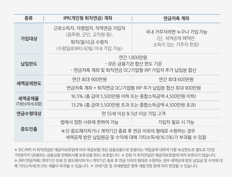 | ✅ 연금투자 제도 소개 [퇴직연금 제도] -DB/DC(확정급여형/확정기여형): 근로자의 퇴직급여 재원을 회사가 운용(DB)하거나 근로자 개인이 직접 운용(DC)하여 근로자가 퇴직 후 연금 또는 일시금으로 받아 노후에 쓸 수 있도록 하는 제도 -IRP(개인형 퇴직연금): 근로자가 이직 또는 퇴직할 때 퇴직급여를 적립하거나, 본인 부담으로 추가 납입한 자금을 연금 등 노후자금으로 활용할 수 있게 하는 제도 [개인연금 제도] -연금저축: 일정기간 납입 후 연금 형태로 인출할 경우 연금소득으로 과세되는 세제혜택을 받을 수 있는 제도 |