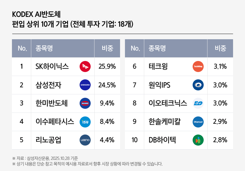 KODEX AI반도체에 투자하면 국내 TOP2인 삼성전자와 SK하이닉스를 필두로 국내 AI 반도체 산업 전반의 종목에 분산투자가 가능합니다.