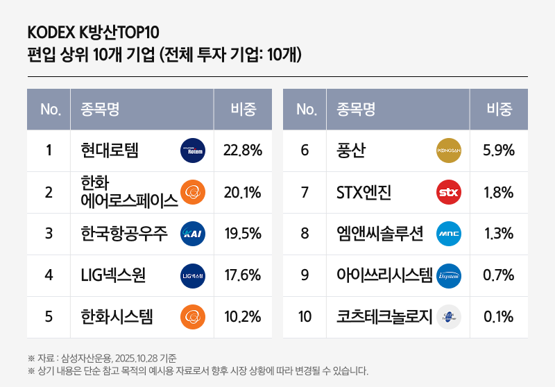 KODEX K방산TOP10 ETF는 방산 매출 비중이 높은 ‘진짜 방산기업’ 10종목에 집중 투자합니다. 고마진 확보와 정책 수혜를 기대할 수 있는 수출 중심 기업을 선별해 성장성을 높이고, AI 방산 첨단기술을 보유한 기업을 함께 담아 확장성을 강화했습니다.