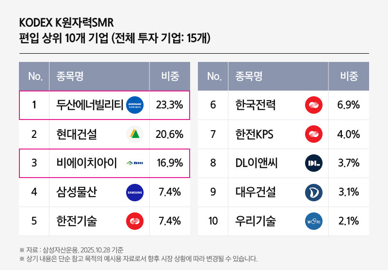 KODEX K원자력SMR ETF는 차세대 원전인 SMR에 집중 투자하며, 대표 종목인 두산에너빌리티, 현대건설, 비에이치아이에 집중 투자합니다. 과거 ‘팀코리아’ 방식의 국가주도형 단일 수출 모델에서 벗어나, 글로벌 파트너십을 기반으로 한 개별 기업 중심의 수출 경쟁 체제로 변화하고 있습니다.
