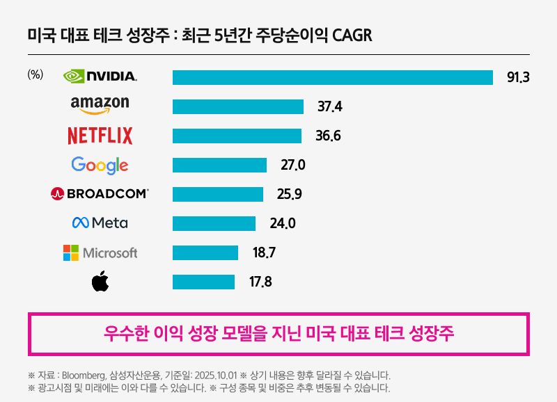 ‘KODEX 미국성장커버드콜액티브ETF’의 기초 포트폴리오는 미국 대표 테크 기업들로 구성됩니다. 엔비디아, 아마존, 구글, 메타, 마이크로소프트 등 우수한 현금흐름과 이익성장을 기반으로 글로벌 시장을 이끌어 온 기업들인데요. 해당 기업들은 최근 5년간 높은 수준의 이익 성장률을 기록*하고 있습니다.