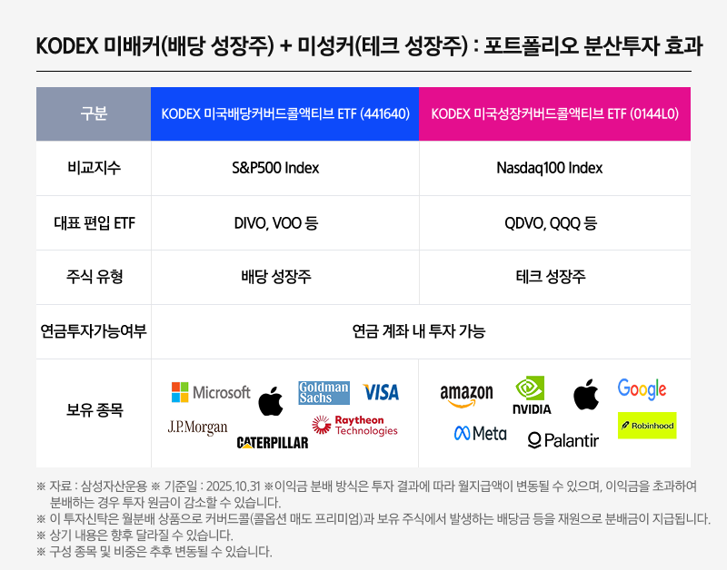 즉, 미성커와 미배커를 함께 묶는다면 성장 모멘텀과 꾸준한 현금 흐름, 이렇게 성격이 다른 두 축을 함께 가져가는 셈입니다.
