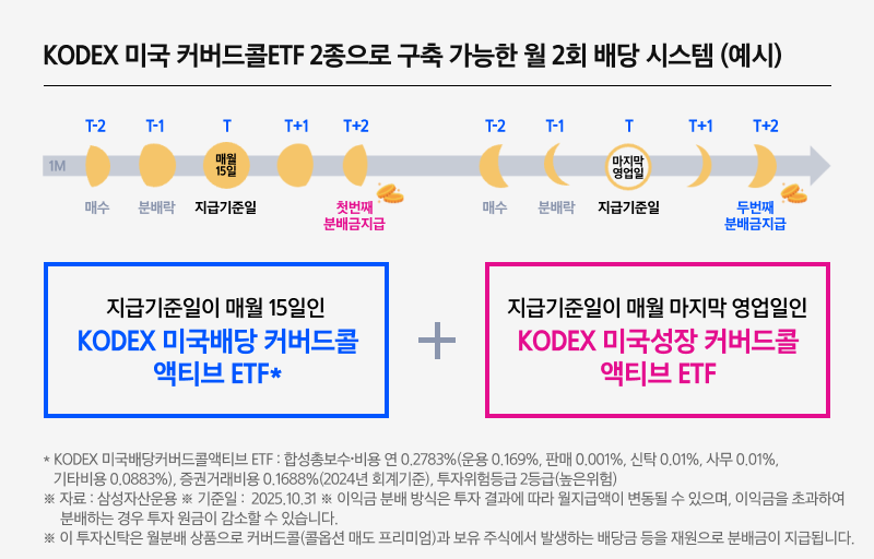 미국 테크 시장은 여전히 글로벌 성장의 중심축으로 평가되고 있고, 관련 기업들의 이익 구조도 성장 기조를 유지하고 있습니다. 이와 동시에 시장 변동성에 대응하며 월 2회 현금 흐름까지 고려한다면 ‘미성커’와 ‘미배커’ 조합은 상당히 매력적인 포트폴리오가 될 수 있겠습니다. 이에 더해 연금계좌까지 활용 가능한 ‘KODEX 미국배당커버드콜액티브 ETF’와 ‘KODEX 미국성장커버드콜액티브 ETF’ 조합에 주목해보시는 건 어떨까요?