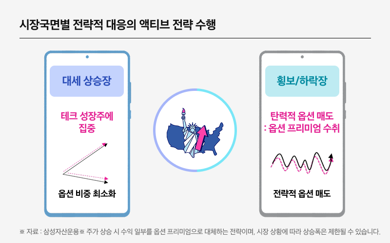 예를 들어, 대세 상승장에는 주식 보유 비중을 유지해서 상승에 참여를 하고 횡보 및 하락장에서는 옵션 매도를 확대해서 프리미엄을 확보하는 것이지요.