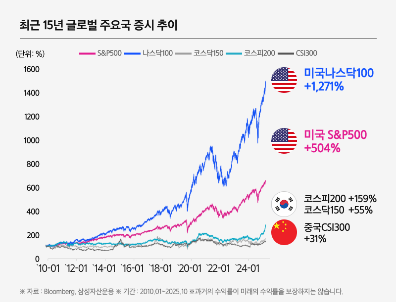 특히 연금 투자나 장기 투자를 고민하는 분들에게 대표지수는 더욱 의미가 있습니다. 미국은 지난 수십 년간 끊임없는 혁신과 기업 성장을 이어온 시장이고, 실제로 장기 수익률 측면에서도 다른 주요 국가 대비 우수한 성과를 보여왔죠. 변동성은 있더라도 시간이 지날수록 회복과 성장을 반복해온 시장이라는 점이 가장 큰 강점입니다.