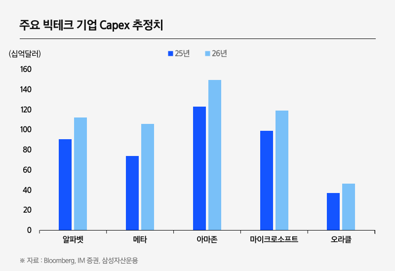또한 미-중 패권 싸움이 심화되면서 자국 중심의 AI 생태계 구축을 위한 정부와 기업의 투자 확대가 지속되고 있습니다. 실제 주요 빅테크 기업의 2026년 Capex 추정치는 2025년 대비 증가하였는데요. 2026년에도 생성형 AI · AI 반도체 · AI인프라 기업의 유기적 협력 체제 구축 강화로 관련 AI 섹터의 관심이 지속될 것으로 보입니다.