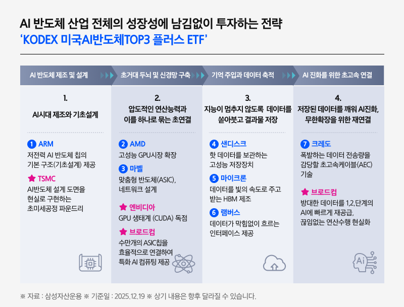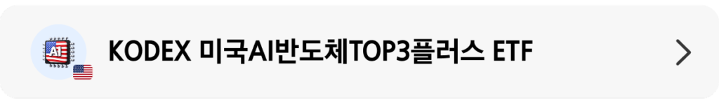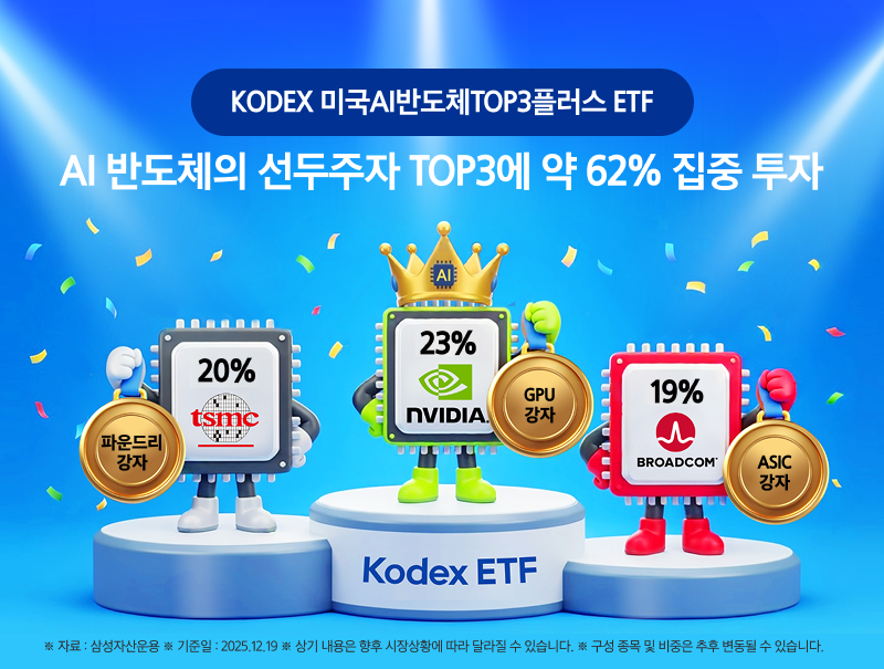 | 📌 KODEX 미국AI반도체TOP3플러스 ETF ✅ 엔비디아, TSMC, 브로드컴, AI반도체 TOP3에 약 62% 압축 투자 (2025.12.19 기준) ✅ AI반도체 밸류체인의 주요 기업 7개 추가 선별 ✅ AI패권경쟁 변화에도 꾸준히 주목받는 AI반도체 투자 *상기 내용은 시장 상황에 따라 달라질 수 있습니다. |