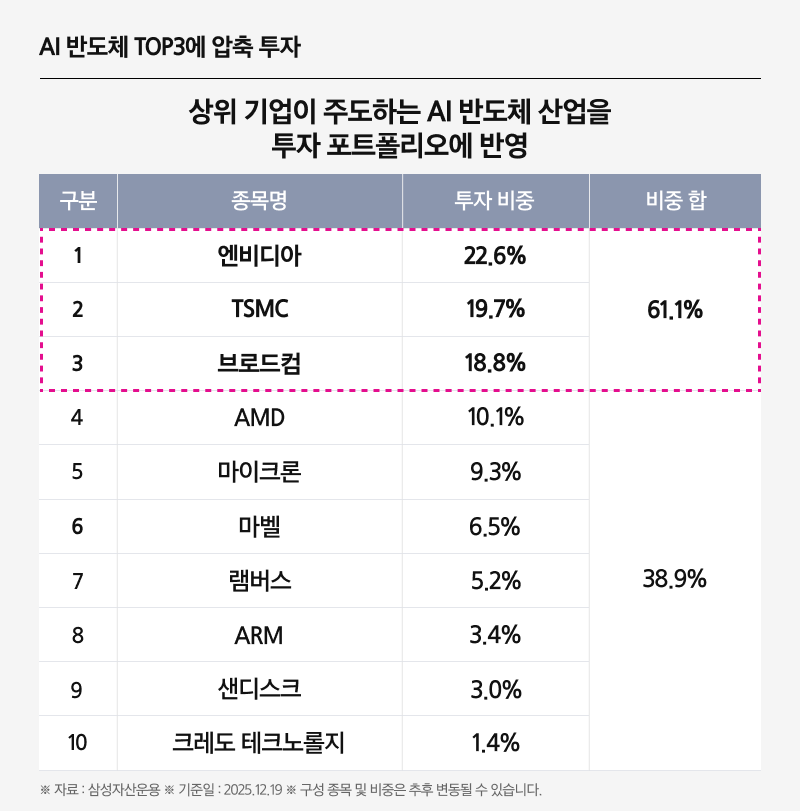 이를 통해 개별 기업의 흥망이나 단기 기술 경쟁에 집중하기보다, AI 반도체 산업 전반의 수혜를 기대할 수 있도록 포트폴리오를 구성하고 있습니다.