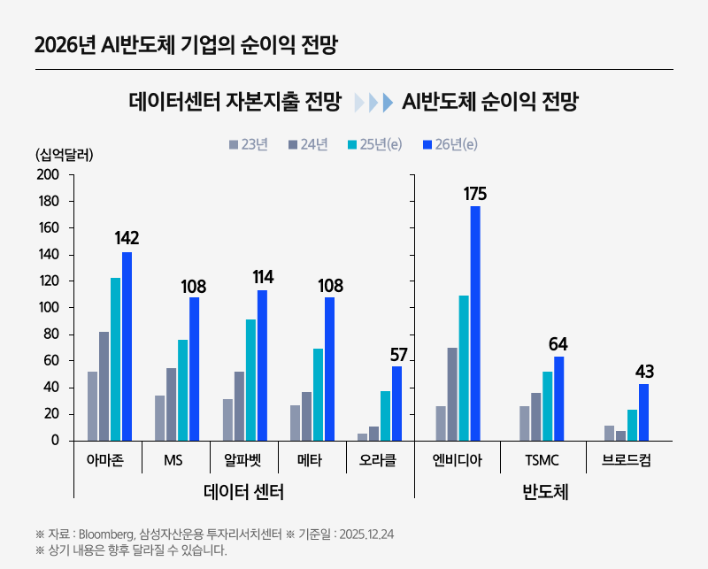 아마존과 MS 등 글로벌 빅테크 기업들의 데이터센터 투자 확대 흐름이 이어지고 있으며, 이와 함께 엔비디아, TSMC, 브로드컴 등 주요 AI 반도체 기업들의 순이익 역시 확대될 전망입니다.