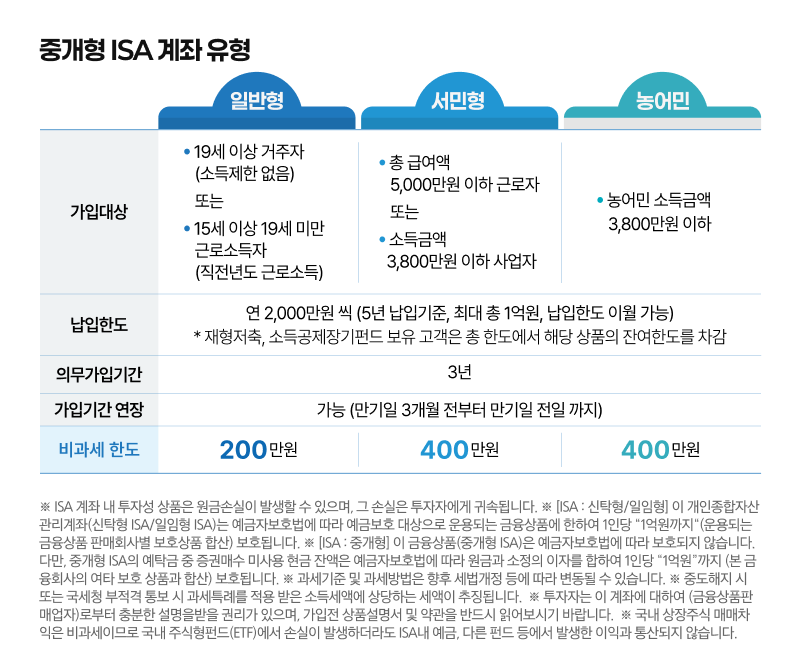 우선, ISA 계좌 가입자는 소득수준에 따라 일반형과 서민형으로 나누어 비과세 혜택을 받게 됩니다. 일반형의 경우, 대한민국 거주자라면 누구나 가입가능한 기본형으로, 200만원 한도 수익까지 비과세 혜택을 받으실 수 있습니다. 또한, ‘나의 소득이 5천만원 이하다’ 하시는 분들은 서민형으로, 일반형보다 2배 많은 400만원까지 비과세 혜택을 받으실 수 있습니다.