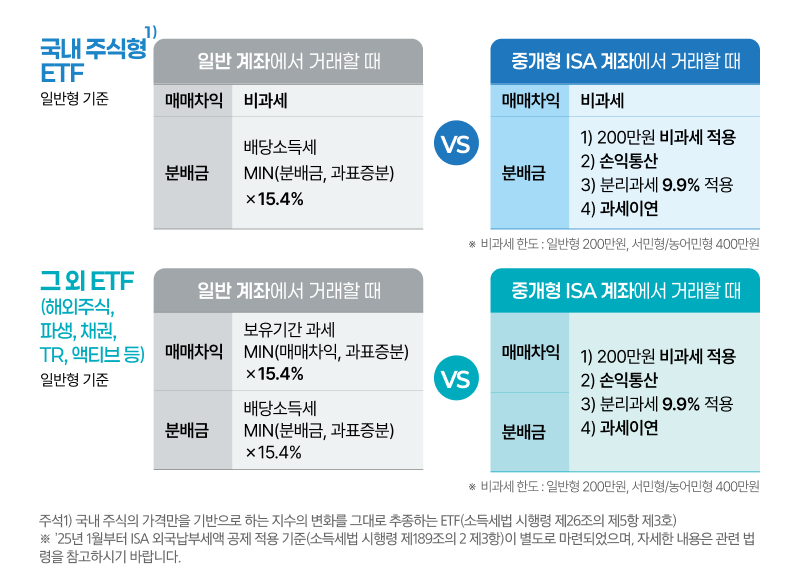 일반 계좌에서 국내상장ETF에 투자하면, 매매차익과 배당금에 대해서 15.4%의 배당소득세가 붙는데요, 하지만 ISA라는 든든한 방패를 활용한다면 이야기가 달라집니다.