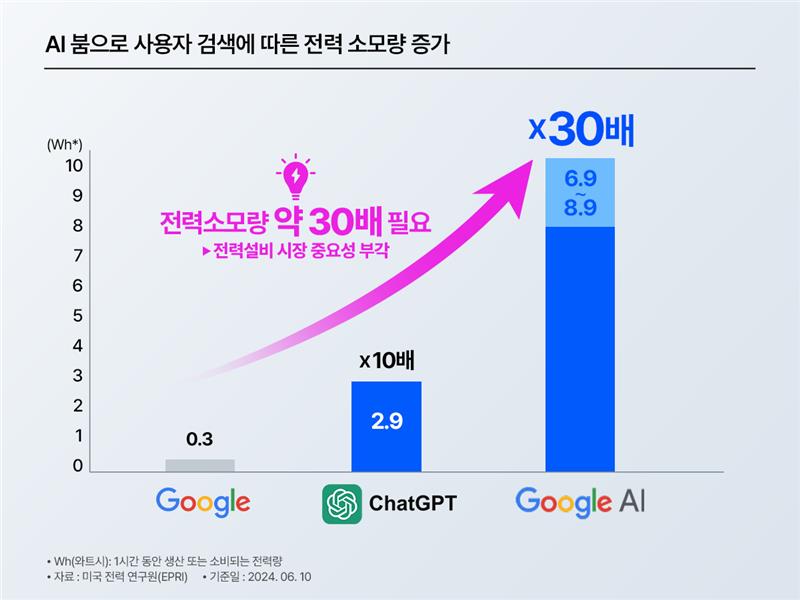 ‘AI 붐으로 사용자 검색에 따른 전력 소모량 증가’ 막대그래프. Google은 0.3Wh, ChatGPT는 2.9Wh(약 10배), Google AI는 6.9~8.9Wh(약 30배)로 표시되며 ‘전력소모량 약 30배 필요’와 ‘x30배’가 강조됨.