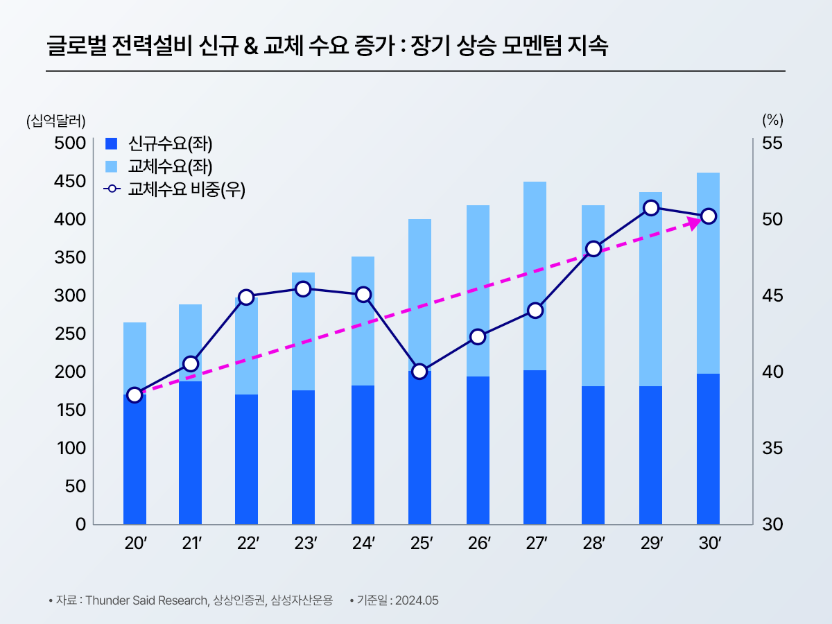 막대+선 결합 그래프: ‘글로벌 전력설비 신규 & 교체 수요 증가’. 2020~2030년 신규수요·교체수요(좌축)와 교체수요 비중(우축)이 장기 상승하는 흐름을 표시.