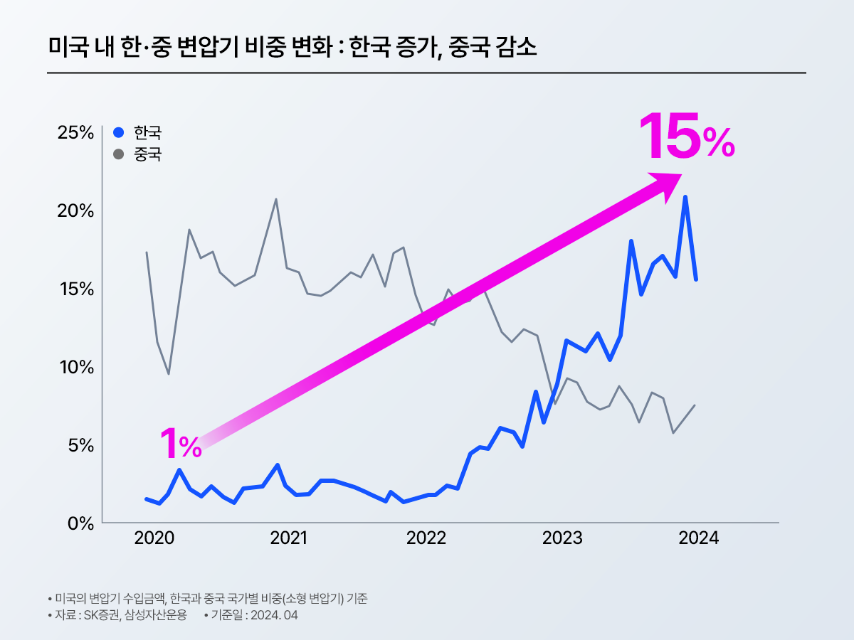 선그래프: ‘미국 내 한·중 변압기 비중 변화’. 한국(파란선) 비중이 2020년 약 1%에서 2024년 약 15%로 증가, 중국(회색선) 비중은 감소.
