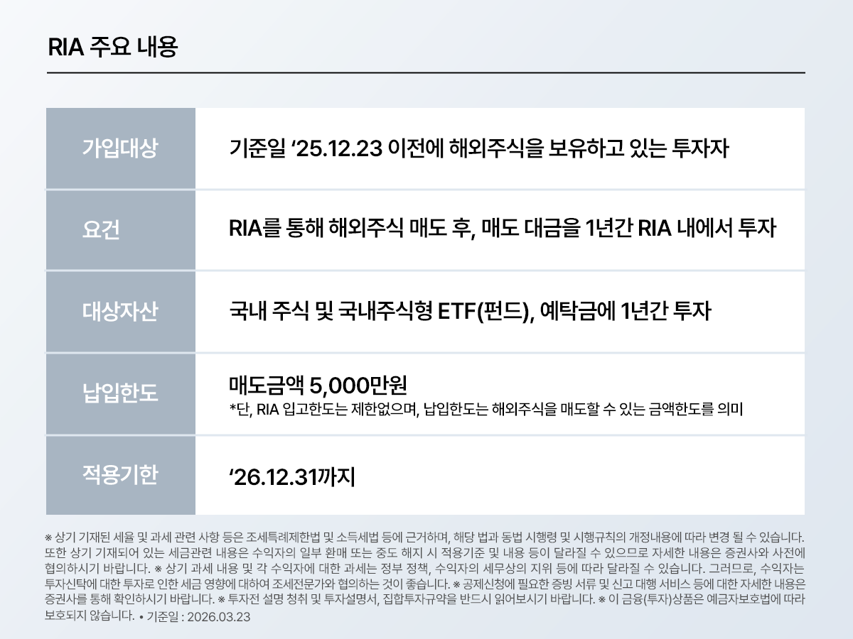 해외주식에 투자하고 있다면 절대 놓쳐서는 안 될 소식이 있습니다. 바로 국내시장 복귀계좌(RIA, Reshoring Investment Account)인데요. 쉽게 말해 해외주식을 팔고 그 자금을 국내 시장에 재투자하면 해외주식 양도소득세를 크게 줄여주는 ‘2026년 한정판 절세 혜택 계좌’입니다.