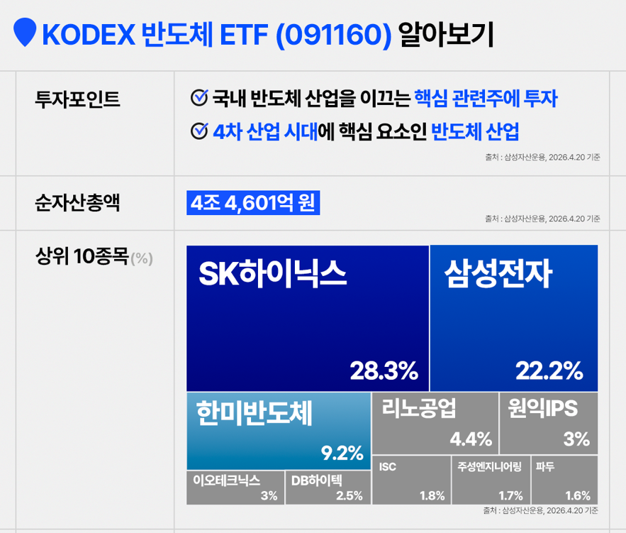 KODEX 반도체 ETF(091160) 상세 소개 이미지. 투자포인트로 국내 반도체 산업을 이끄는 핵심 관련주에 투자, 4차 산업 시대의 핵심 요소인 반도체 산업에 집중한다는 점이 제시돼 있다. 순자산총액은 4조 4,601억 원이다. 상위 10종목 비중은 SK하이닉스 28.3%, 삼성전자 22.2%, 한미반도체 9.2%, 리노공업 4.4%, 원익IPS 3.0%, 이오테크닉스 3.0%, DB하이텍 2.5%, ISC 1.8%, 주성엔지니어링 1.7%, 파두 1.6%로 정리돼 있다. 한줄 투자 포인트는 삼성전자와 SK하이닉스를 중심으로 국내 반도체 대표주에 폭넓게 투자하는 ETF라는 점이다.