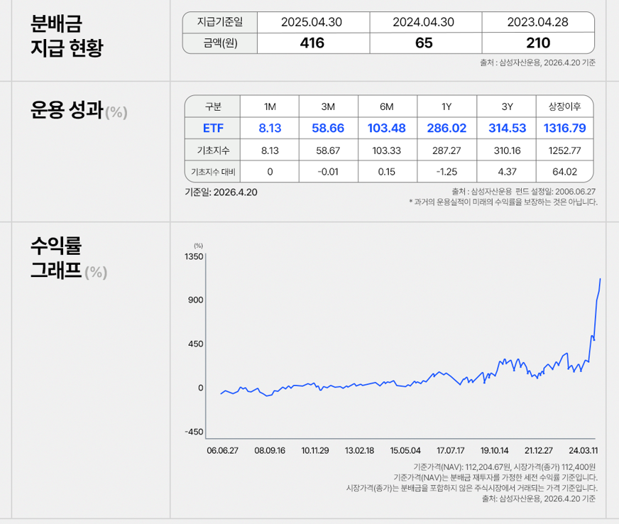 KODEX 반도체 ETF의 분배금 지급 현황, 운용 성과, 장기 수익률 추이를 정리한 이미지. 분배금은 2025년 4월 30일 416원, 2024년 4월 30일 65원, 2023년 4월 28일 210원 지급된 것으로 표시돼 있다. 운용 성과는 기준일 2026년 4월 20일 기준으로 1개월 8.13%, 3개월 58.66%, 6개월 103.48%, 1년 286.02%, 3년 314.53%, 상장 이후 1316.79%다. 비교 기초지수 수익률은 각각 8.13%, 58.67%, 103.33%, 287.27%, 310.16%, 1252.77%이며, 기초지수 대비 차이는 0, -0.01, 0.15, -1.25, 4.37, 64.02로 안내된다. 하단에는 장기 수익률 그래프와 함께 기준가격(NAV) 112,204.67원, 시장가격(종가) 112,400원이 표기돼 있다. 한줄 투자 포인트는 최근 반도체 업황 강세 속에서 장단기 수익률이 크게 확대된 상품이라는 점이다.