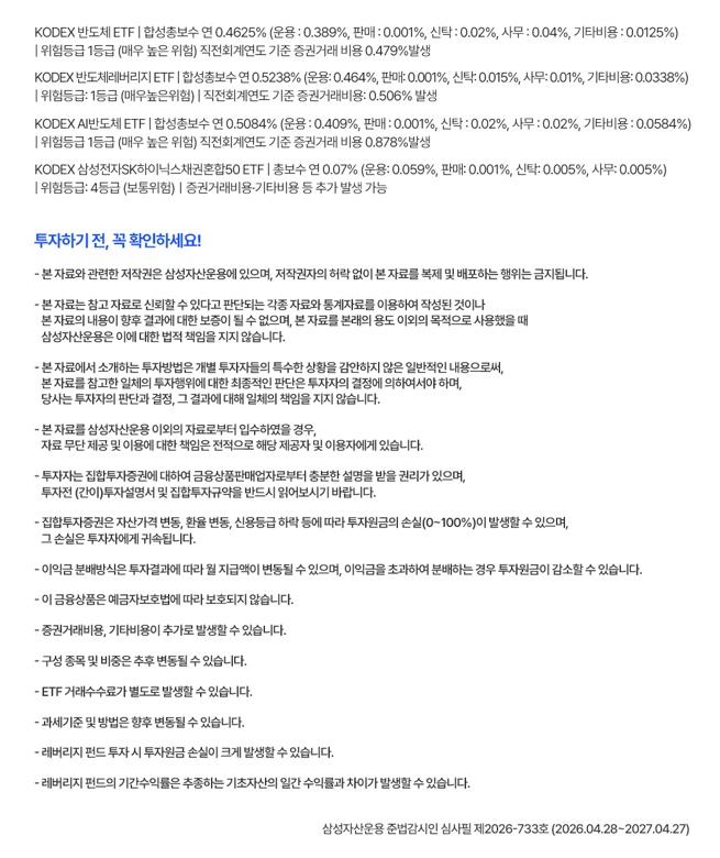 각 상품 정보는 다음과 같다. KODEX 반도체 ETF는 합성총보수 연 0.4625%, 위험등급 1등급, 직전회계연도 기준 증권거래비용 0.479%. KODEX 반도체레버리지 ETF는 합성총보수 연 0.5238%, 위험등급 1등급, 증권거래비용 0.506%. KODEX AI반도체 ETF는 합성총보수 연 0.5084%, 위험등급 1등급, 증권거래비용 0.878%. KODEX 삼성전자SK하이닉스채권혼합50 ETF는 총보수 연 0.07%, 위험등급 4등급으로 안내된다. 이어서 원금 손실 가능성, 예금자보호 비대상, 거래비용 발생, 구성 종목 및 비중 변동 가능성, 과세기준 변경 가능성, 레버리지 상품의 높은 위험과 기초자산 일간 수익률과의 차이 발생 가능성 등의 유의문구가 포함돼 있다. 하단에는 삼성자산운용 준법감시인 심사필 제2026-733호(2026.04.28~2027.04.27)가 표기돼 있다.