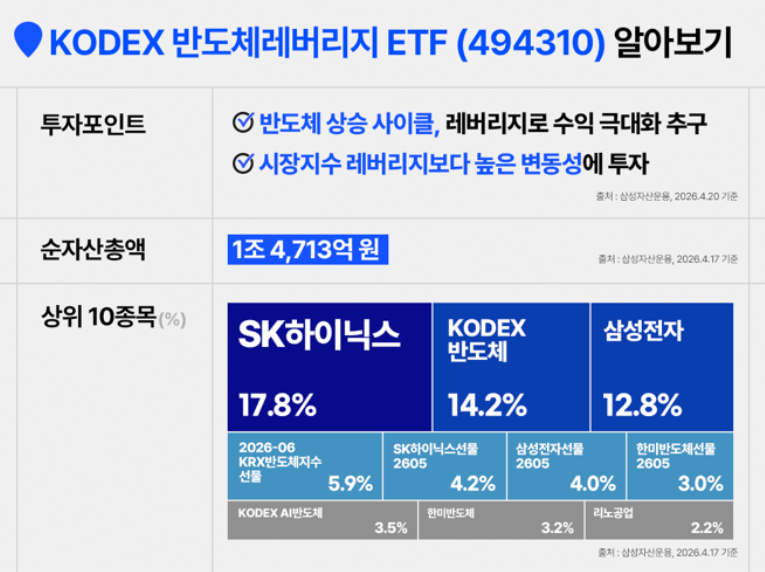 KODEX 반도체레버리지 ETF(494310) 상품 개요 이미지. 투자포인트로 반도체 상승 사이클에 레버리지로 수익 극대화를 추구하고, 시장지수 레버리지보다 높은 변동성에 투자한다는 내용이 제시돼 있다. 순자산총액은 1조 4,713억 원이다. 상위 10종목 비중은 SK하이닉스 17.8%, KODEX 반도체 14.2%, 삼성전자 12.8%, 2026-06 KRX반도체지수 선물 5.9%, SK하이닉스선물2605 4.2%, 삼성전자선물2605 4.0%, 한미반도체선물2605 3.0%, KODEX AI반도체 3.5%, 한미반도체 3.2%, 리노공업 2.2%로 표시돼 있다.