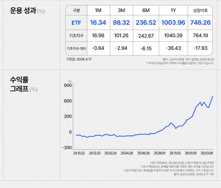 KODEX 반도체레버리지 ETF(494310)의 운용성과 이미지. 기간별 수익률은 1개월 16.34%, 3개월 98.32%, 6개월 236.52%, 1년 1003.96%, 상장이후 746.26%로 제시돼 있다. 비교지수 수익률은 1개월 16.98%, 3개월 101.26%, 6개월 242.67%, 1년 1040.39%, 상장이후 764.19%이며, 기초지수 대비는 -0.64, -2.94, -6.15, -36.43, -17.93이다. 하단에는 상장 이후 큰 폭으로 상승한 수익률 추이 그래프가 함께 담겨 있다. 기준일은 2026.4.17이다.