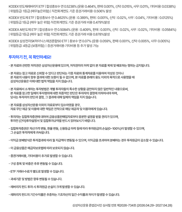 KODEX 반도체레버리지 ETF, KODEX 반도체 ETF, KODEX AI반도체 ETF, KODEX 삼성전자SK하이닉스채권혼합50 ETF의 총보수 및 비용 정보와 투자유의문구가 정리된 이미지. KODEX 반도체레버리지 ETF는 합성총보수 연 0.5238%, 위험등급 1등급, KODEX 반도체 ETF는 합성총보수 연 0.4625%, 위험등급 1등급, KODEX AI반도체 ETF는 합성총보수 연 0.5084%, 위험등급 1등급, KODEX 삼성전자SK하이닉스채권혼합50 ETF는 총보수 연 0.07%, 위험등급 4등급으로 안내돼 있다. 이어서 원금 손실 가능성, 예금자보호 비대상, 증권거래비용 및 기타비용 발생, 구성 종목 및 비중 변동 가능, ETF 거래수수료 발생, 과세기준 및 방법 변경 가능, 레버리지 펀드 특성상 투자원금 손실 확대 가능 등의 투자 전 확인사항이 긴 문단으로 포함돼 있다.
